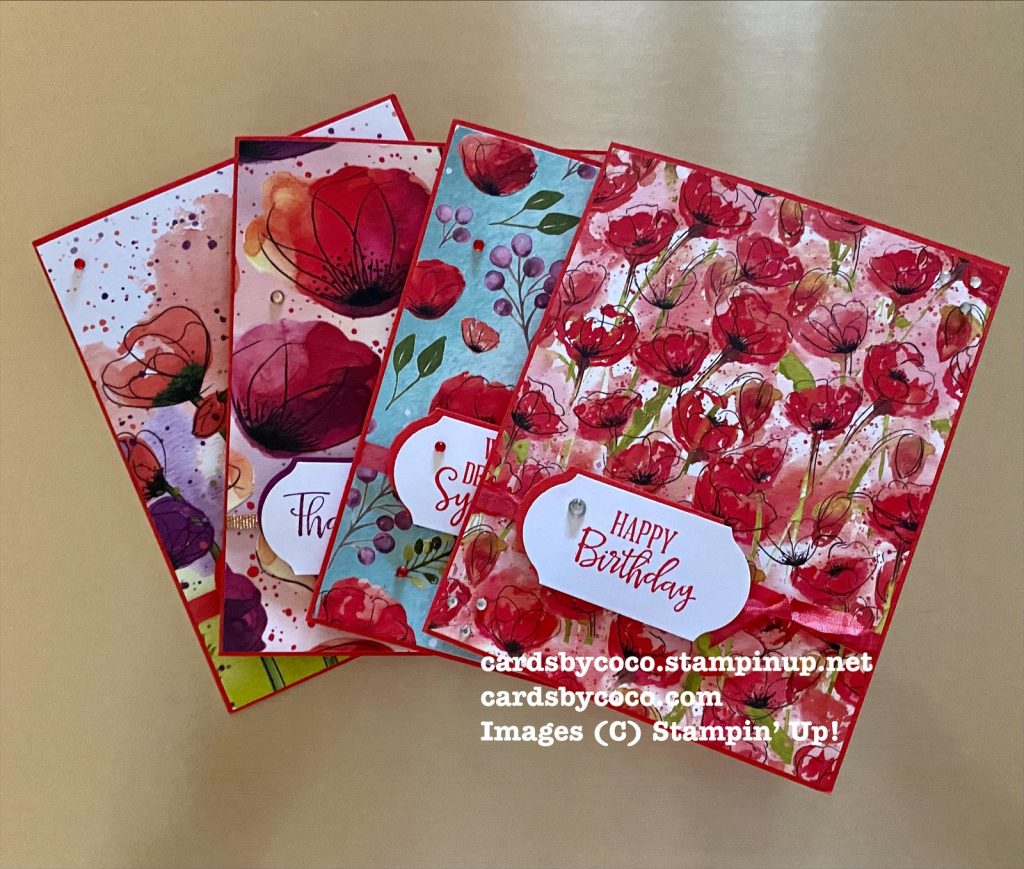 Today’s cards feature how easy it is to create a gift set using cardstock, ink and designer series paper! I am using the retired Peaceful Poppies Designer Series paper but plan on making another